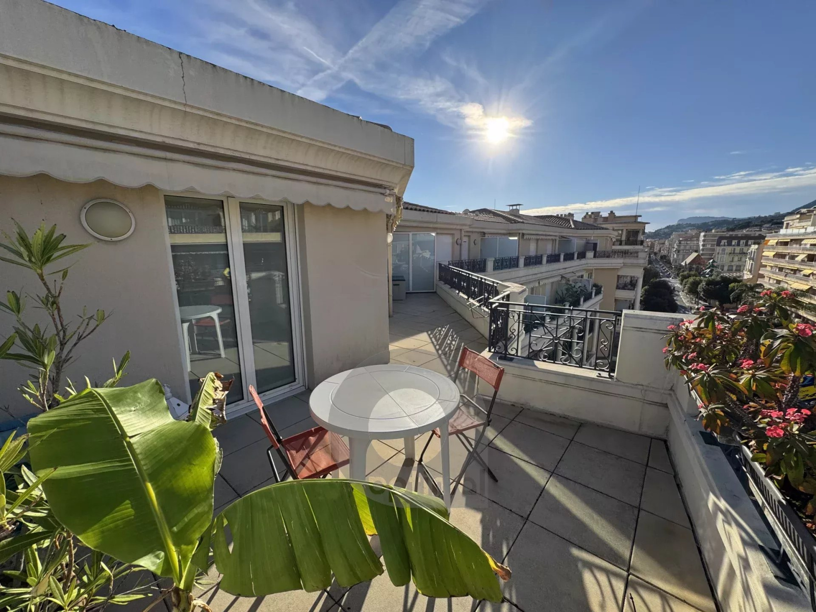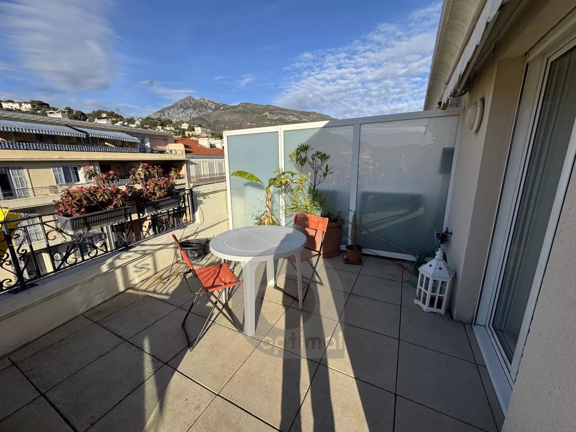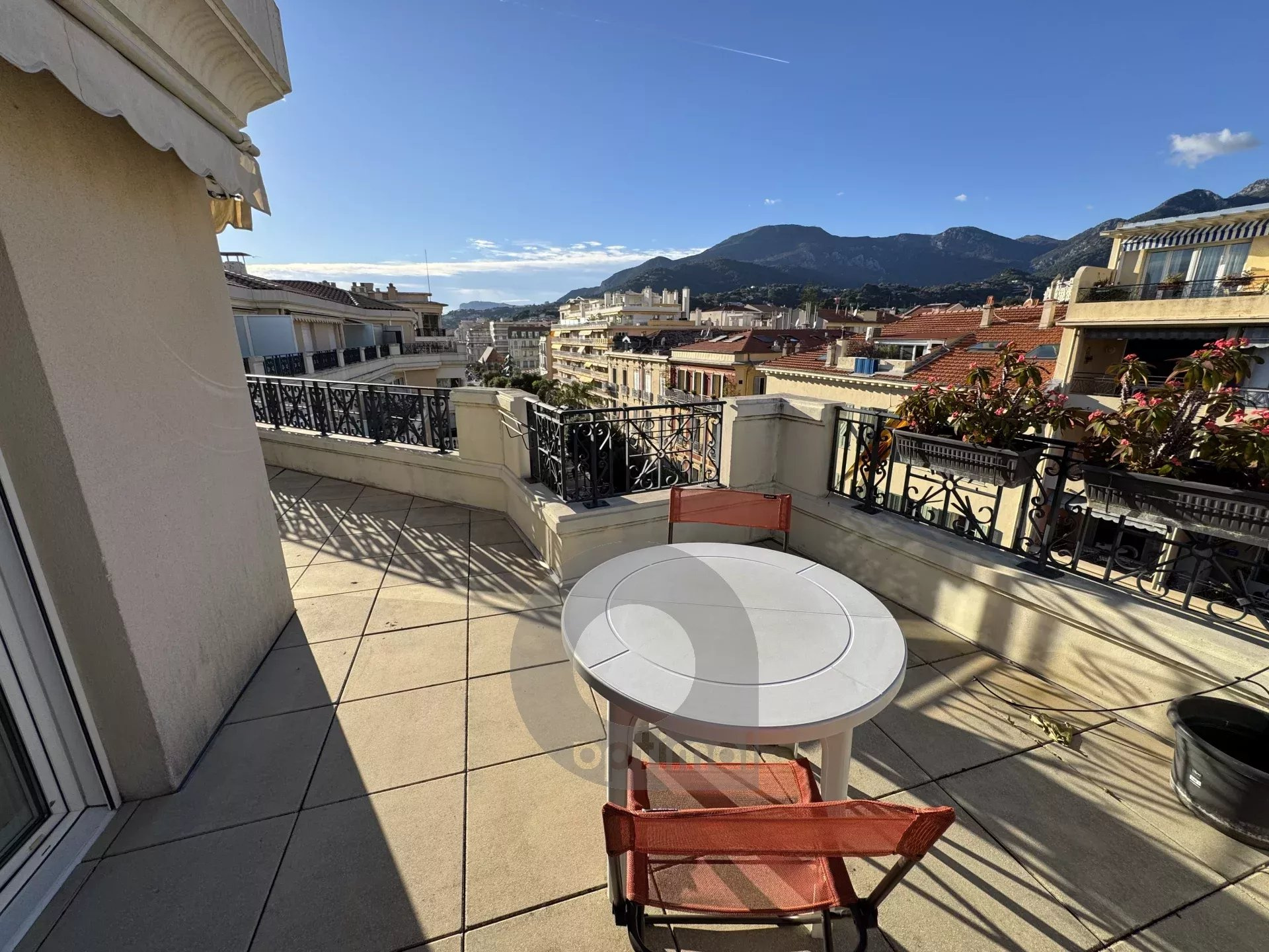 Deux pièces au dernier étage avec grande terrasse Dans un immeuble prestigieux situé dans le centre de Menton, au sixième et dernier étage, nous proposons un appartement de deux pièces de 44,16 m² avec une grande terrasse. L'appartement se compose d'une entrée, d'un grand salon avec cuisine ouverte, d'une salle de bains avec baignoire, d'une chambre avec placard et d'une grande terrasse de 23 m². L'appartement est vendu entièrement meublé. Possibilité de parking en supplément du prix.